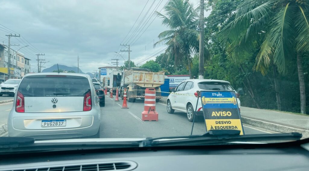Uma obra realizada pela ES Gás na manhã desta quarta-feira (23) gerou congestionamentos na região central de Guarapari. A intervenção, localizada após a ponte, no sentido Muquiçaba, afeta o fluxo de veículos em vias de grande movimentação. Segundo relatos, o engarrafamento já ultrapassa o bairro Ipiranga, chegando à região da Praia do Riacho.
