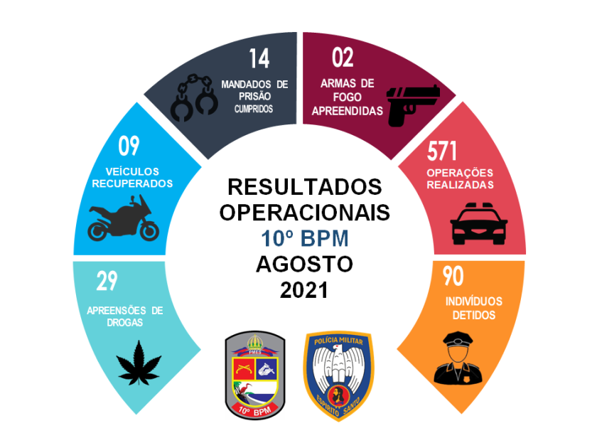 O 10º Batalhão da Polícia Militar de Guarapari divulgou na última quarta-feira (1º) os resultados operacionais obtidos durante todo o mês de agosto. Ocorrências como: apreensão de armas de fogo (02), veículos recuperados (09), mandados de prisão cumpridos (14) e apreensão de drogas (29).
