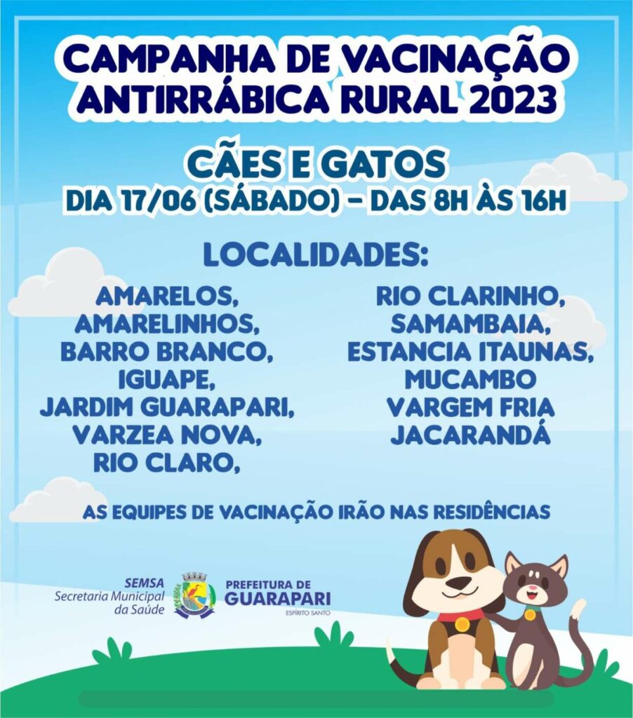 Nesse sábado (17), acontece a 2ª fase da Campanha Municipal de Vacinação, contra a Raiva. A ação, promovida pela Secretaria Municipal de Saúde de Guarapari (Semsa), por meio do Centro de Controle de Zoonoses (CCZ), acontece na zona rural, durante os meses de junho, julho e agosto. Já na área urbana, a campanha de vacinação acontecerá durante o mês de setembro.