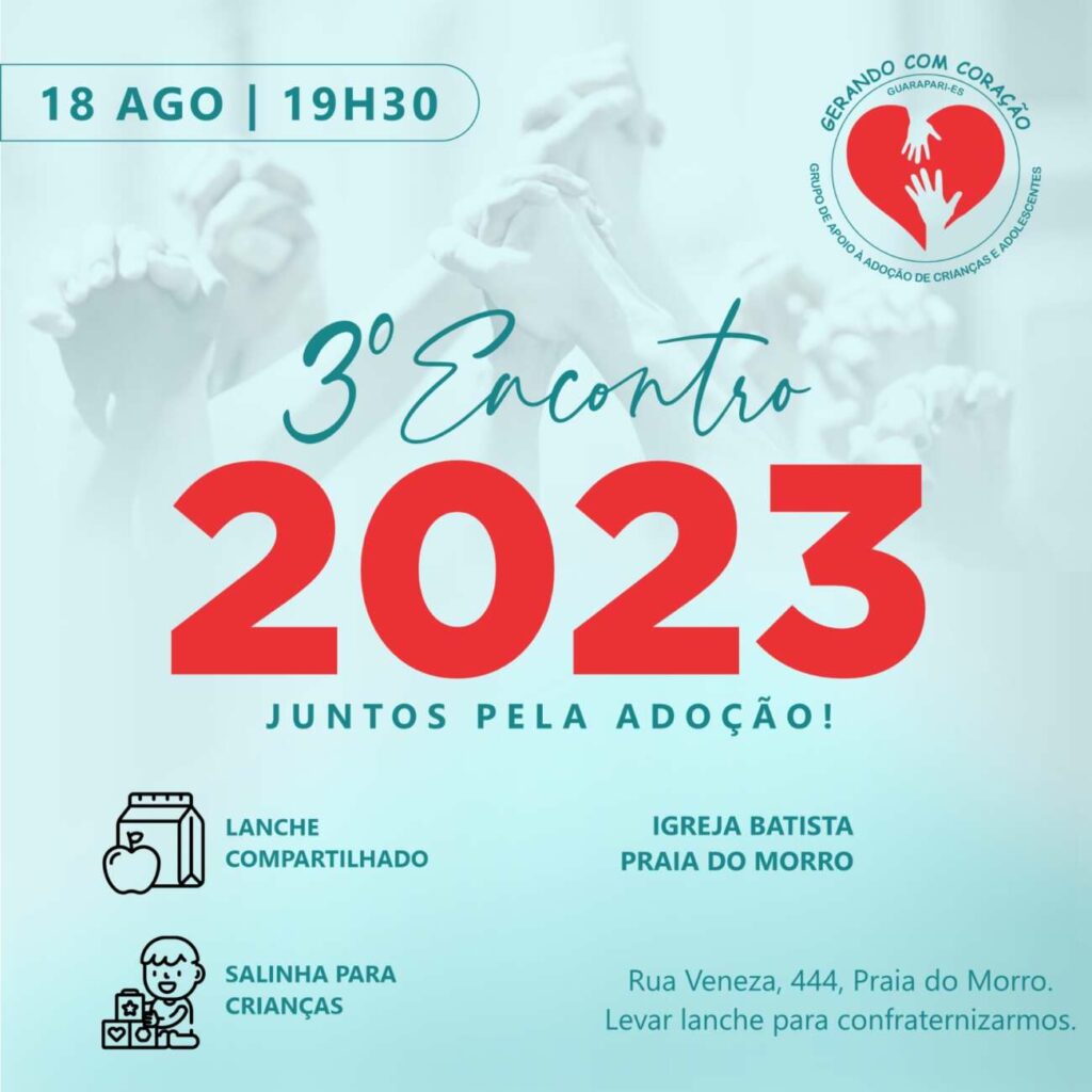 O grupo Gerando com Coração, que realiza um trabalho de informação para pais e mães que veem a adoção como uma forma de constituir uma família, realiza hoje (18) o 3º Encontro Juntos pela Adoção. A reunião acontece na Igreja Batista Praia do Morro, a partir das 19h30.
