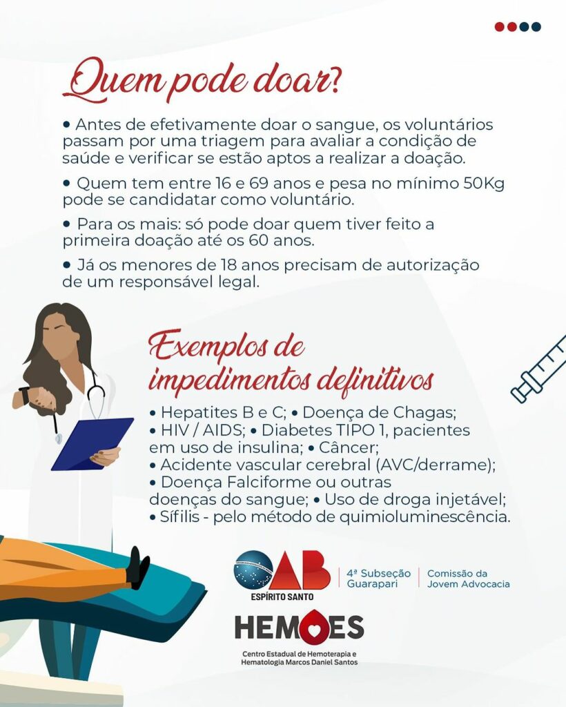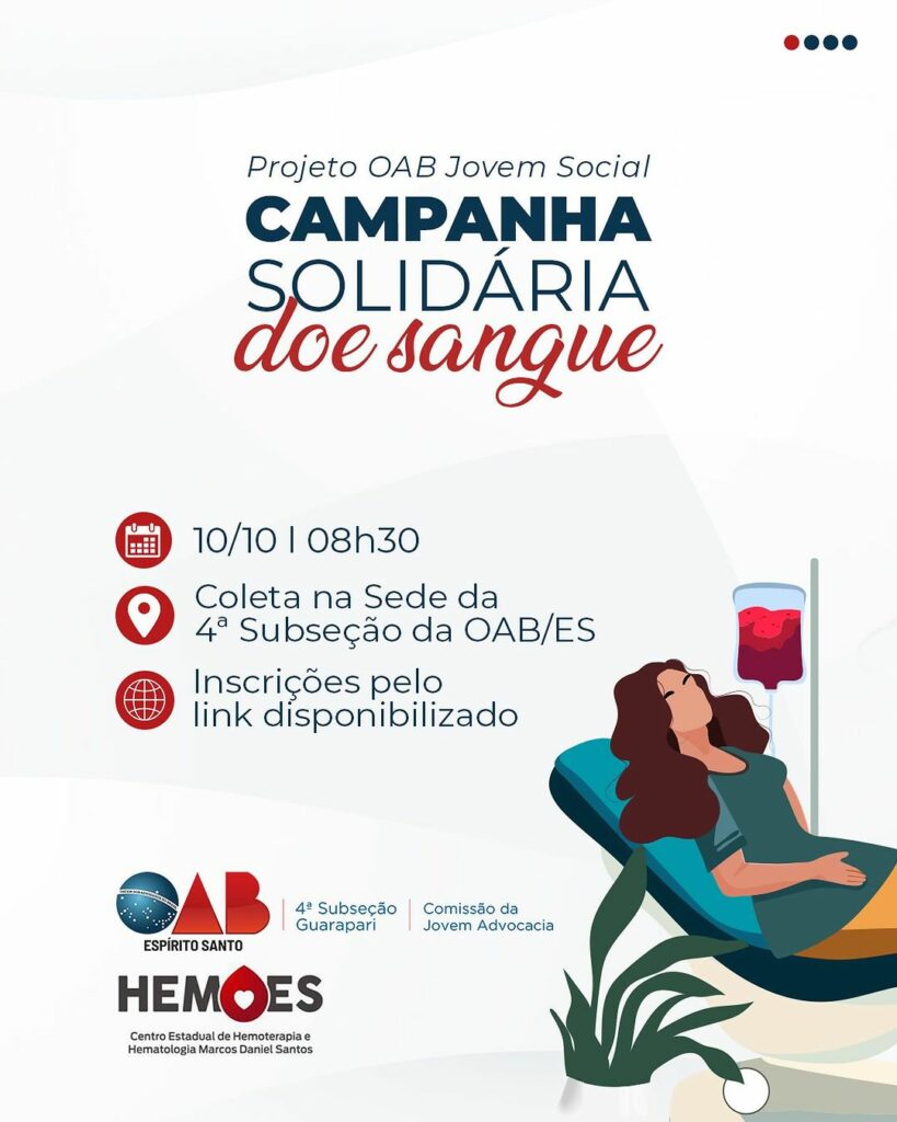 A Comissão OAB Jovem da 4ª Subseção da OAB Guarapari realiza, no próximo dia 10 de outubro, a primeira edição da campanha de doação de sangue na sede da instituição. A iniciativa pretende reunir advogados e a comunidade local em um gesto de solidariedade e cidadania.
