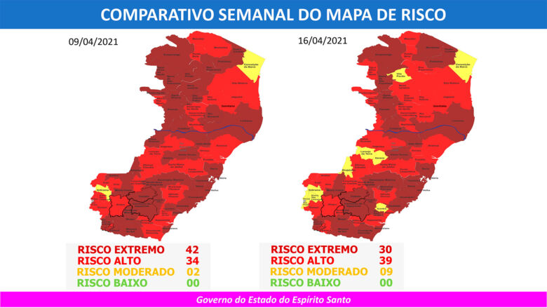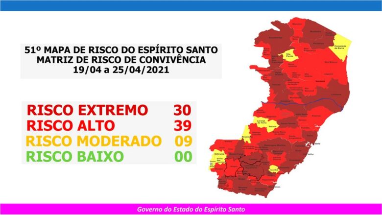 Dos 78 municípios capixabas, 30 municípios estão classificados em Risco Extremo. 39 municípios estão classificados em Risco Alto e 9 em Risco Moderado. Não há municípios classificados em Risco Baixo. A classificação de risco para Guarapari e Anchieta não se alterou, e ambos seguem em risco extremo.