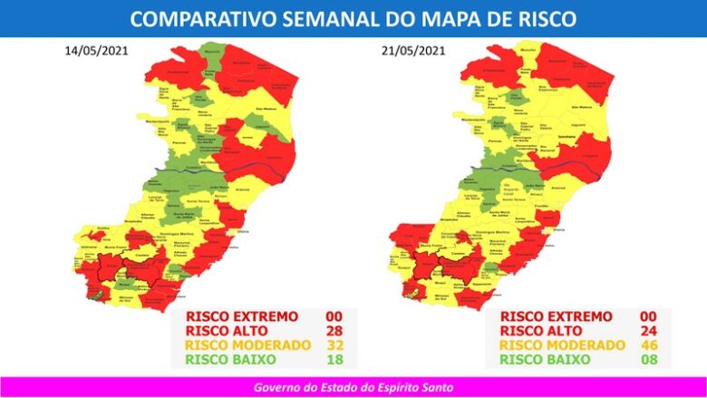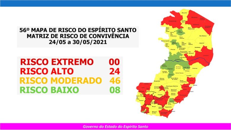 O Governo do Estado anunciou, nesta sexta-feira (21), o 56º Mapa de Risco Covid-19, que terá vigência de segunda-feira (24) até o próximo domingo (30). Dos 78 municípios capixabas, 24 estão classificados como de risco alto, 46 como de risco moderado e 8 em risco baixo. Não há municípios classificados em risco extremo. Guarapari e Anchieta seguem classificadas em risco alto, enquanto Alfredo Chaves continua em risco.
