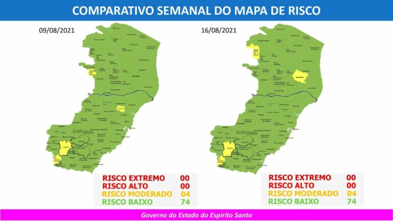 RISCO BAIXO: Afonso Cláudio, Águia Branca, Alfredo Chaves, Anchieta, Apiacá, Aracruz, Atílio Vivácqua, Baixo Guandu, Barra de São Francisco, Boa Esperança, Bom Jesus do Norte, Brejetuba, Cachoeiro de Itapemirim, Cariacica, Castelo, Colatina, Conceição da Barra, Conceição do Castelo, Divino de São Lourenço, Domingos Martins, Dores do Rio Preto, Ecoporanga, Fundão, Governador Lindenberg, Guaçuí, Guarapari, Ibatiba, Ibiraçu, Ibitirama, Iconha, Irupi, Itaguaçu, Itapemirim, Itarana, Iúna, Jaguaré, Jerônimo Monteiro, João Neiva, Laranja da Terra, Linhares, Mantenópolis, Marataízes, Marechal Floriano, Marilândia, Mimoso do Sul, Montanha, Mucurici, Muniz Freire, Muqui, Nova Venécia, Pancas, Pedro Canário, Pinheiros, Piúma, Ponto Belo, Presidente Kennedy, Rio Bananal, Rio Novo do Sul, Santa Leopoldina, Santa Maria de Jetibá, Santa Teresa, São Domingos do Norte, São Gabriel da Palha, São Mateus, São Roque do Canaã, Serra, Vargem Alta, Venda Nova do Imigrante, Viana, Vila Pavão, Vila Valério, Vila Velha e Vitória.