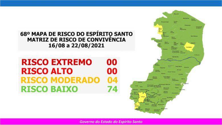 O Governo do Estado divulgou, na tarde desta sexta-feira (13), o 68º Mapa de Risco Covid-19, que terá vigência desta segunda-feira (16) até o próximo domingo (23). Alfredo Chaves, Anchieta, Guarapari e os demais municípios da região seguem em Risco Baixo. Ao todo 74 municípios capixabas estão classificados em Risco Baixo e apenas quatro em Risco Moderado. Não há municípios classificados em Risco Alto.
