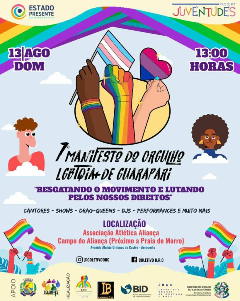 Depois de dez anos, Guarapari volta a receber um manifesto LGBTQIA+ neste domingo (13). É a 7ª edição do evento, que é realizado pelo Coletivo DRC (Diversidade, Resistência e Cultura) e acontece a partir das 13h, no Campo da Associação Atlética Aliança, no bairro Aeroporto, com mais de dez atrações, entre DJs e artistas locais, e o objetivo de promover o respeito à diversidade e a luta por direitos.