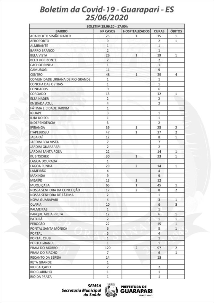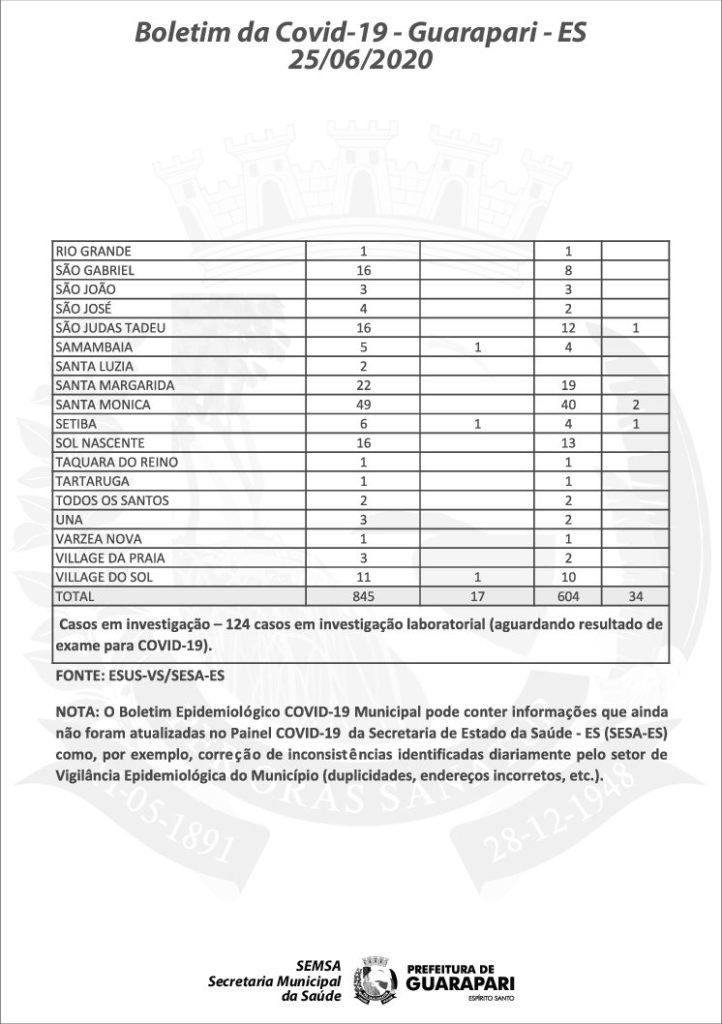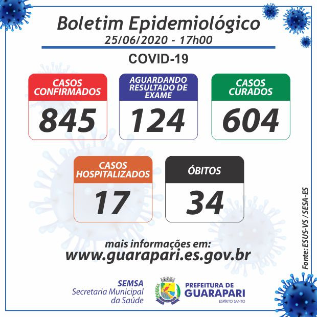 O boletim epidemiológico publicado ontem (25) pela Prefeitura de Guarapari registrou que no município 845 pessoas foram infectadas pelo novo Coronavírus (Covid-19). O número de óbitos pela doença atingiu o número de 34.