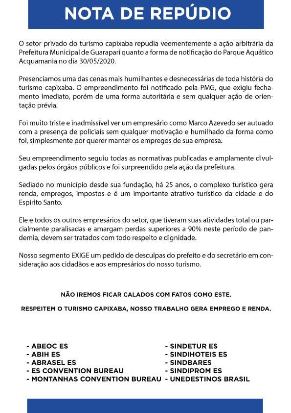 Após o episódio, a Associação de Hotéis e Turismo de Guarapari – AHTG se manifestou com uma nota de repúdio sobre a forma como foi realizada a ação da prefeitura, assim como fez o setor privado do turismo capixaba.