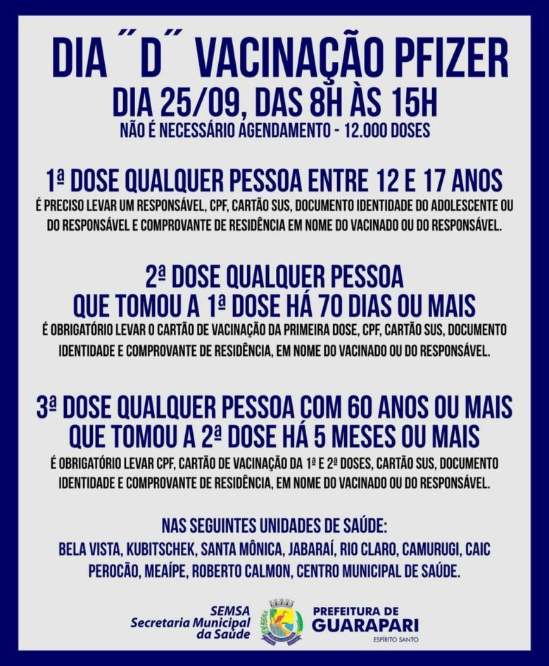 Marcado para acontecer nesse sábado (25), das 8h às 15h, o Dia D de imunização contra a Covid-19 será realizado sem agendamento e direcionado para diversos grupos, etapas e faixas etárias. Serão disponibilizadas 12 mil doses da vacina Pfizer.