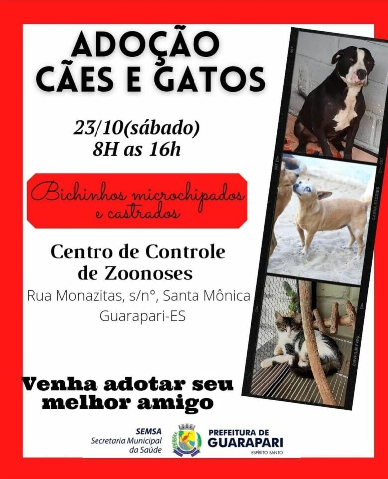 Neste sábado (23), o Centro de Controle de Zoonoses (CCZ) promove uma ação para adoção de cães e gatos; ao todo serão 15 animais disponíveis. Necessário somente documento de identificação com foto e comprovante de residência.