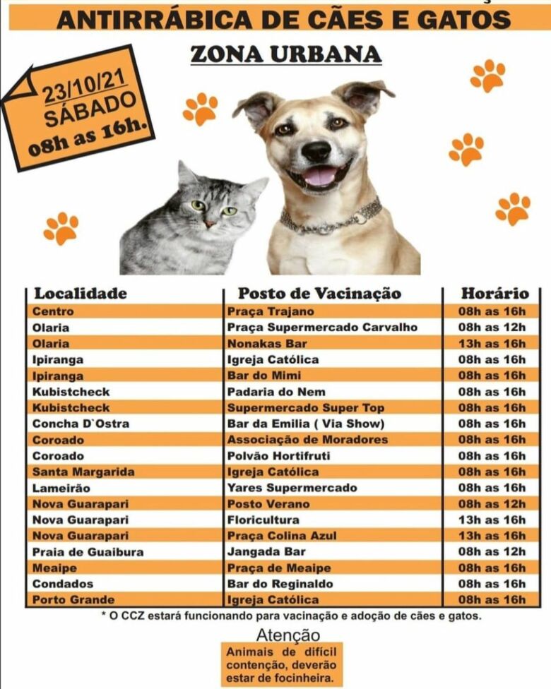 Ocorrerá também neste sábado a vacinação antirrábica de animais domésticos. Necessária focinheira caso o animal seja de difícil contenção. Confira os locais e horários para a imunização dos animais: