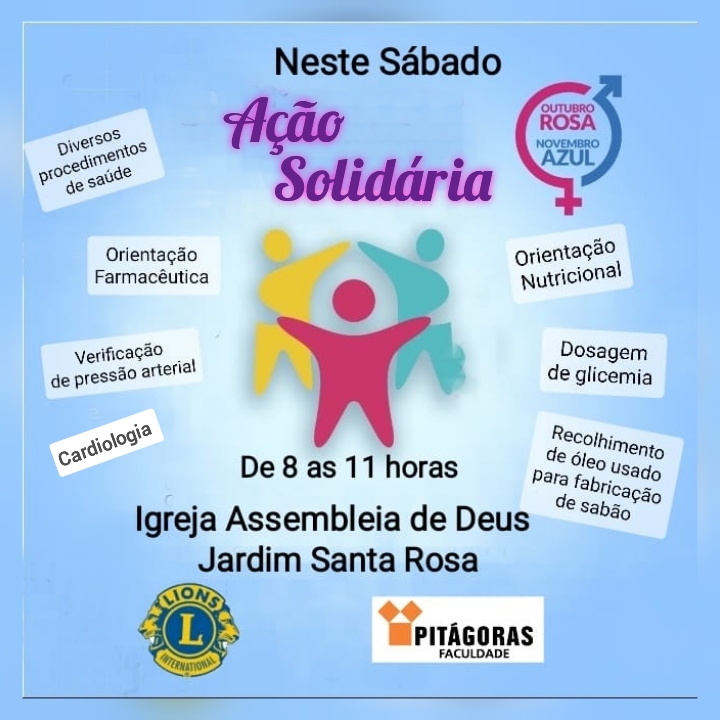 Uma ação solidária, que acontecerá no próximo sábado (30), irá ofertar serviços gratuitos à população de Guarapari. Organizada pela Faculdade Pitágoras, Lions Clube e Prefeitura de Guarapari, a ação será realizada durante a parte da manhã na Igreja Assembleia da Deus, no bairro Santa Rosa.