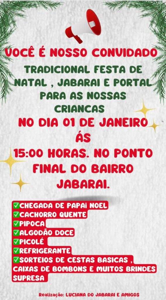 Realizada há mais de 20 anos, a tradicional festa de Natal para as crianças dos bairros Jabaraí e Portal, em Guarapari, aconteceria no dia 25 de dezembro, mas, por conta da chuva precisou ser adiada e será realizada, no mesmo formato, neste domingo (01), às 15h, no ponto final do Jabaraí.