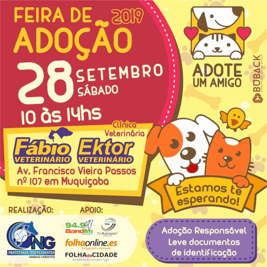Outra ação mobilizada pela Ong Protetores Independentes/ Animais Carentes acontece nesse sábado (28) em Guarapari. Uma nova edição da feira de adoção de cães e gatos será realizada na Clínica Dr. Fábio Veterinário, em Muquiçaba. Uma nova chance de tirar os animais das ruas e oferecer um lar. Nas últimas edições, foram adotados, em cada uma, em torno de 15 a 20 cachorros e gatos abandonados na cidade.