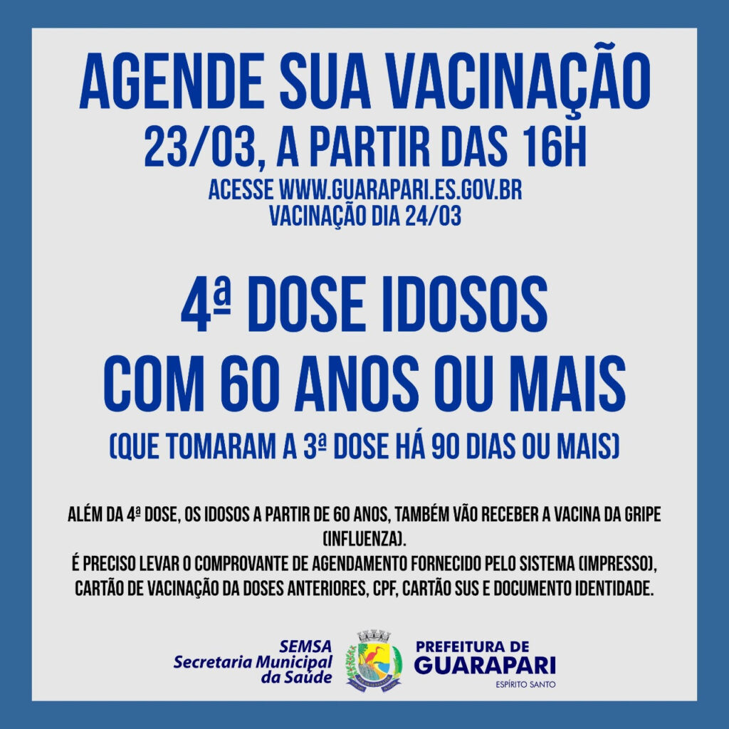 A Prefeitura de Guarapari, através da Secretaria de Saúde (Semsa), abre nessa quarta-feira (23), no site da prefeitura a partir das 16h, o primeiro agendamento para 4ª dose de pessoas com 60 anos ou mais. Podem fazer o agendamento pessoas que já receberam a 3ª dose há pelo menos 90 dias.