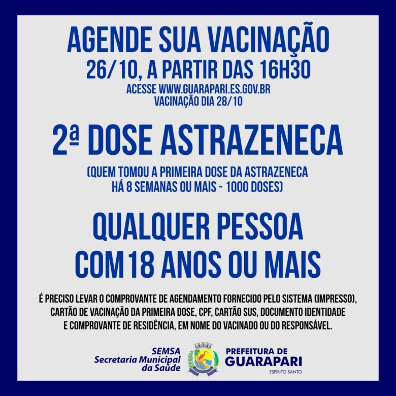A Prefeitura de Guarapari, por meio da Secretaria Municipal de Saúde (Semsa), abre nesta terça (26), às 16h30, mais um agendamento para qualquer pessoa acima de 18 anos, que precisa tomar a segunda dose da AstraZeneca. A vacinação é voltada para quem tomou a primeira dose da mesma vacina há 8 semanas ou mais.