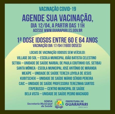 Guarapari vai realizar, a partir das 11h dessa segunda-feira (12), o agendamento da vacinação de 1ª dose contra a Covid-19 para de idosos entre 60 e 64 anos. A Prefeitura divulgou o agendamento por meio de postagem em rede social na tarde de ontem (09).