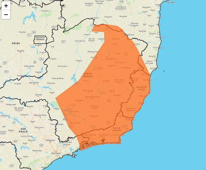 O Instituto Nacional de Meteorologia – INMET emitiu nesta segunda-feira (06) um aviso de chuva entre 30 e 60 mm/h ou 50 e 100 mm/dia e ventos intensos (60-100 km/h) para todo Espírito Santo, Rio de Janeiro e parte de Minas Gerais. Existe também o risco de corte de energia elétrica, queda de galhos de árvores, alagamentos e de descargas elétricas. A validade do alerta é até amanhã (07).