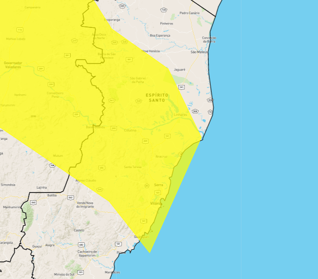 O Instituto Nacional de Meteorologia (Inmet) também emitiu alertas para Guarapari e a região sul do Espírito Santo. O aviso, que está vigente desde as 10h40 desta quinta-feira (06), alerta o acumulado de chuvas entre 20 mm e 50 mm ao dia, além de ventos intensos com velocidade entre 50 km/h e 60 km/h. Também está previsto um risco baixo para o corte de energia elétrica, queda de galhos de árvores, alagamentos e descargas elétricas.