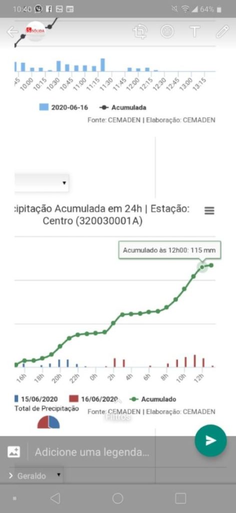 O município de Alfredo Chaves, na região Sul do Estado, registrou 115 milímetros de chuva nas últimas 24h, segundo dados do Centro Nacional de Monitoramento e Alertas de Desastres Naturais (CEMADEN). Moradores estão preocupados. A cidade passou por duas grandes enchentes este ano.