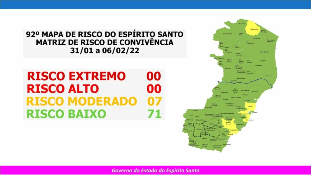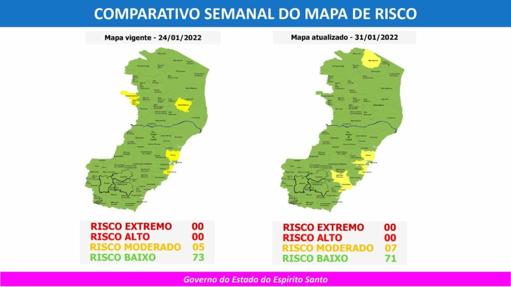 Entre os mapas divulgados entre o dia 24 de dezembro e a última semana, todos os municípios capixabas permaneciam em risco baixo para a Covid-19. Entretanto, desde o 91° Mapa de Risco, cinco cidades voltaram ao risco moderado: Serra e Vila Velha, na Grande Vitória, e Mantenópolis, Alto Rio Novo e Sooretama, no interior capixaba.