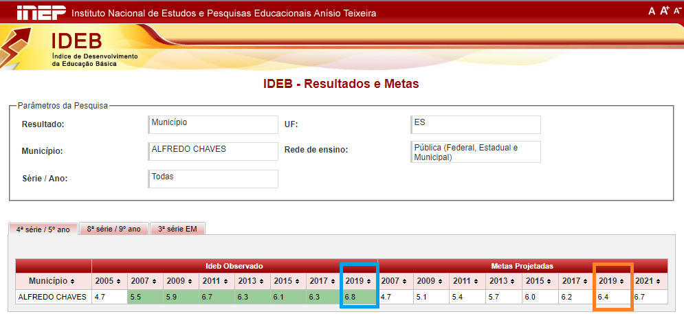 O Índice de Desenvolvimento da Educação Básica (Ideb) foi criado em 2007 para monitorar o desempenho da educação no Brasil e reúne, em um indicador que vai de 0 a 10, os resultados de duas dimensões da qualidade de ensino: o fluxo escolar e as médias de desempenho nas avaliações. O município de Alfredo Chaves destacou-se por superar a meta projetada para o ano de 2019 para a 4ª série / 5º ano, que era de 6,4, ao pontuar 6,8.