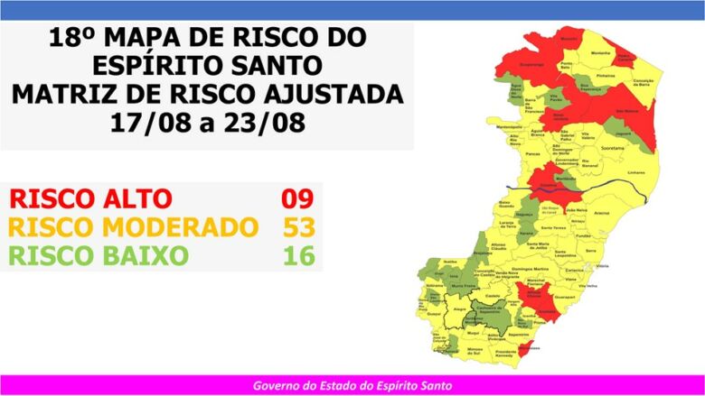 O Governo do Estado anunciou, neste sábado (15), o 18º Mapa de Risco Covid-19, que terá vigência entre a próxima segunda-feira (17) e o domingo (23). Ao todo, 16 municípios capixabas estão classificados em Risco Baixo, outros 53 estão em Risco Moderado, como Guarapari, e nove em Risco Alto, incluindo Alfredo Chaves e Anchieta