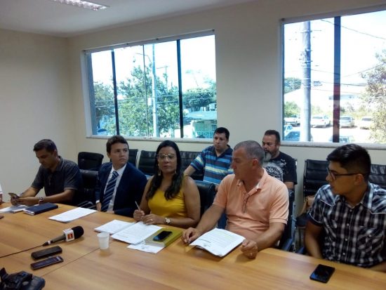 A coletiva contou com a presença do secretário adjunto de meio ambiente, Breno Simões Ramos (primeiro a direita); O secretário adjunto de postura e trânsito, Romildo Scalzer; A secretária de turismo, empreendedorismo e cultura, Letícia Regina; O procurador geral do município, Américo Mignone; O secretário de Esporte e Lazer Cléber Lacerda e a secretária de administração, Aline Dias. Foto: Folha Online.