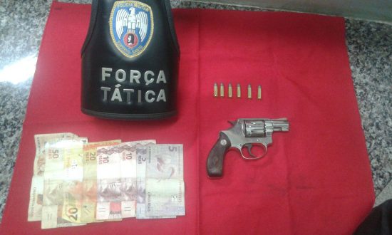 Durante patrulhamento pelo bairro Nova Anchieta, equipes da Força Tática avistaram uma movimentação suspeita em frente a um bar da região. Ao realizarem a abordagem, os militares encontraram na cintura de um dos suspeitos um revólver calibre 32 com seis munições de mesmo calibre e a quantia de R$ 170,00 em dinheiro.