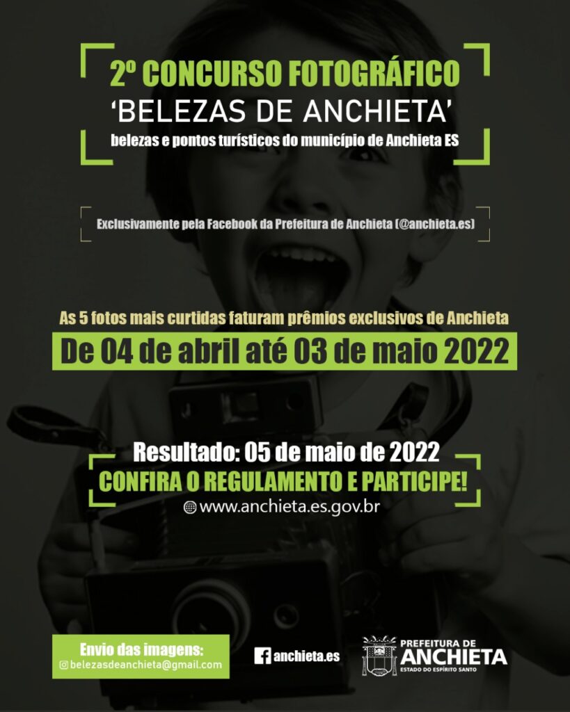 A Prefeitura de Anchieta, por meio da Gerência de Comunicação Social, promove até 04 de maio o 2º Concurso fotográfico Belezas de Anchieta. A competição vai acontecer exclusivamente pelo perfil da prefeitura no Facebook (@anchieta.es). As cinco fotos mais curtidas vão faturar diária em pousada com acompanhante ou pratos exclusivos da culinária do município.