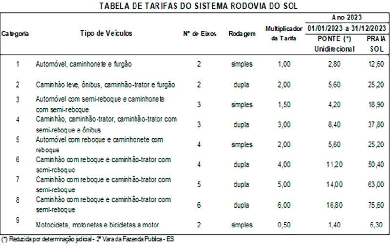 A Agência de Regulação de Serviços Públicos (ARSP) anunciou o reajuste dos preços dos pedágios, a resolução foi publicada no Diário Oficial do Espírito Santo na última sexta-feira (30), que começou a valer nesse domingo (01). O valor da tarifa para carros de passeio será de R$ 2,80 na Terceira Ponte e R$ 12,60 na Rodovia do Sol. De acordo com a ARSP, o novo valor da tarifa é decorrente do reajuste anual previsto no contrato de concessão vigente.