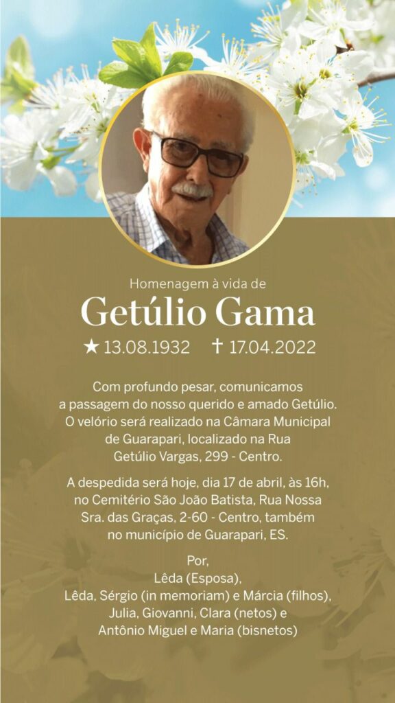 A família do empresário Getúlio Gama, de Guarapari, divulgou neste domingo (17) o óbito do senhor, aos 90 anos de idade. O velório do empresario foi realizado ao longo do dia no plenário da Câmara Municipal de Guarapari.