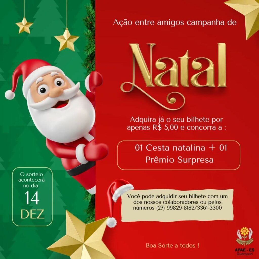 Com o intuito de arrecadar fundos e melhorar a estrutura da instituição, a Apae Guarapari lançou a “Ação entre Amigos – Campanha de Natal 2024”. Os bilhetes para participar da ação, no valor de R$5, já estão disponíveis com os colaboradores ou pelos telefones (27) 99829-8182 ou (27) 3361-3300. Para a iniciativa, será realizado um sorteio valendo prêmios no dia 14 de dezembro.