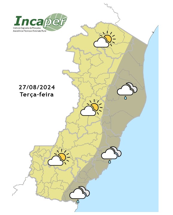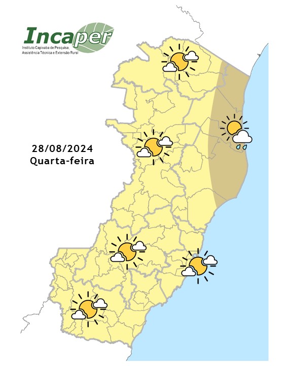 A quarta-feira (28) será marcada por um ar mais seco e frio, o que diminuirá a nebulosidade. Na Grande Vitória, haverá poucas nuvens, sem expectativa de chuva. A temperatura mínima é de 18 °C e a máxima de 30 °C.