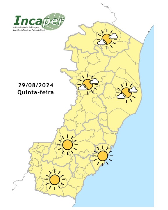 Na quinta-feira (29), o predomínio será de céu claro, e as temperaturas na região metropolitana variam entre 19 °C e 31 °C. Já na sexta-feira (30), o tempo seguirá estável, com poucas nuvens e vento mais suave na Grande Vitória, além de índices de umidade baixos na região oeste do Estado.