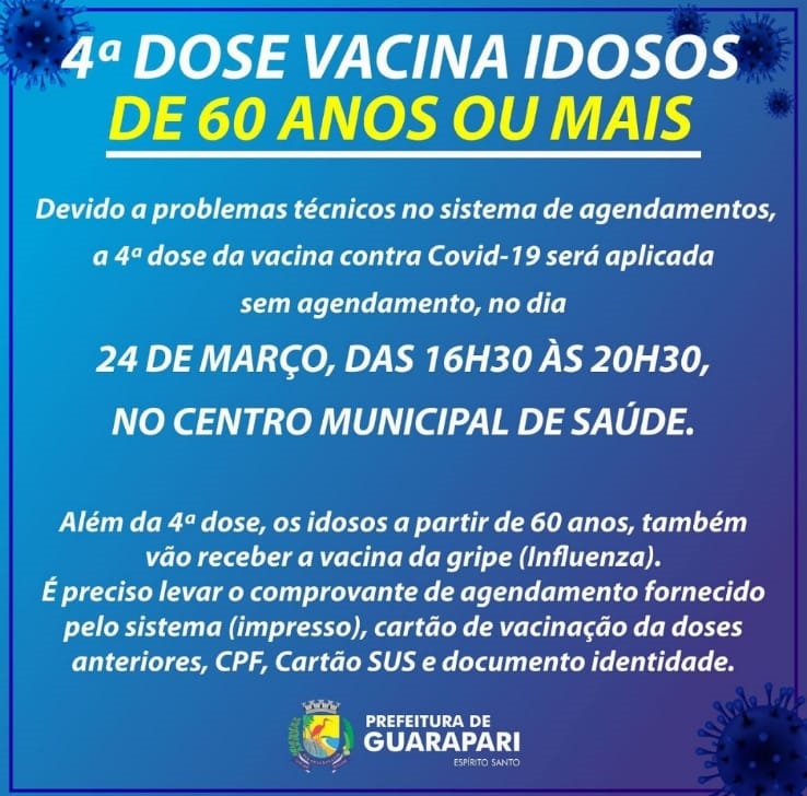 A Prefeitura de Guarapari divulgou há pouco, através das redes sociais, que a vacinação de 4ª dose de vacina contra a Covid-19 em pessoas com 60 anos ou mais acontecerá por livre demanda, não mais por agendamento, conforme divulgado na tarde desta terça-feira (22).