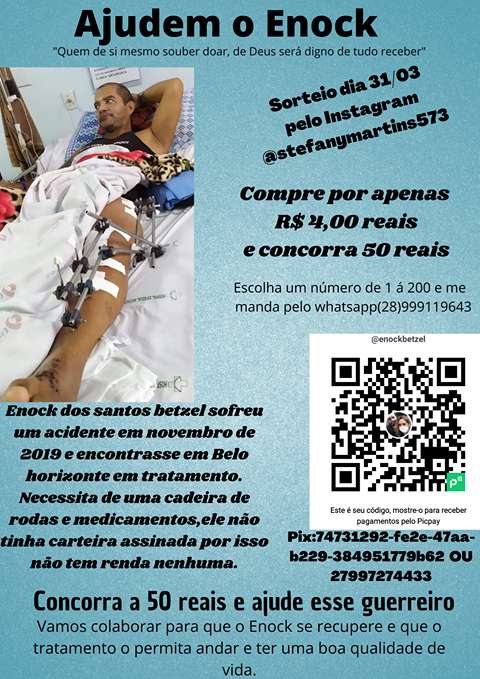 “Em Vitória não tinham recursos e após as duas operações queriam amputar a perna dele. Já em Belo Horizonte farão uma nova cirurgia para arrumar a placa que está na perna dele presa apenas por um parafuso, os outros quebraram e causaram muito dor a Enock”, explicou a esposa, Silvia Regina Viana Queiroz.