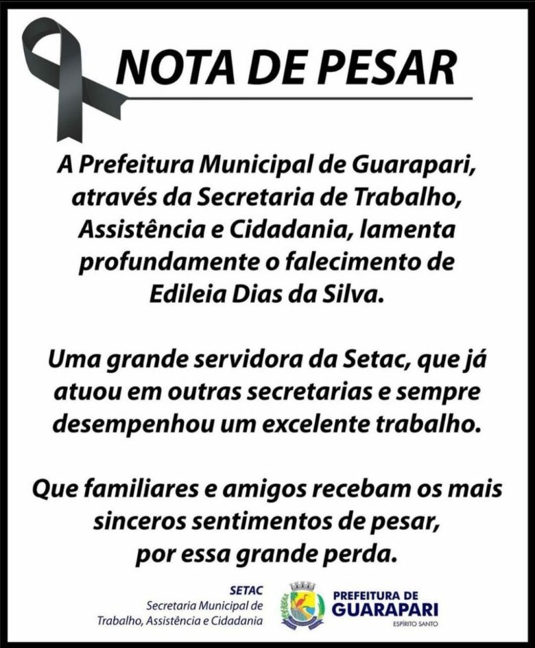 A Prefeitura de Guarapari e o Sindicato dos Servidores de Guarapari (Sintrag) divulgaram notas de pesar pelo óbito da servidora.