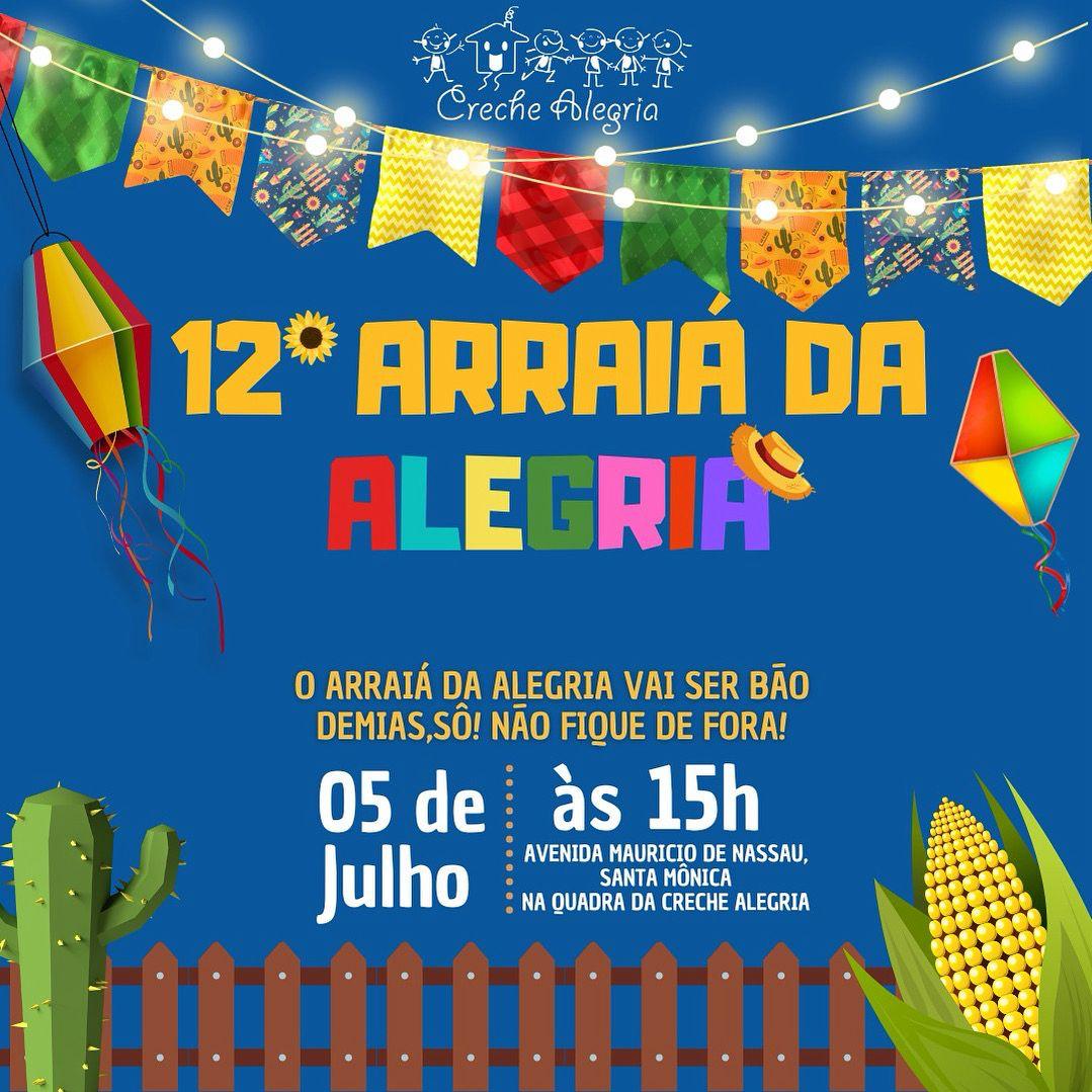 A Creche Alegria realiza no próximo sábado (5), a partir das 15h, o seu tradicional Arraiá da Alegria, que chega à 12ª edição. O evento acontecerá na quadra da instituição, localizada no bairro Santa Mônica, e promete reunir famílias e comunidade em uma tarde repleta de danças, comidas típicas e muita solidariedade.