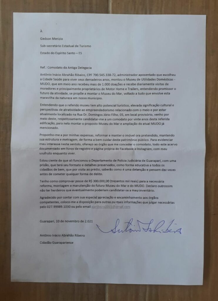 Candidatei-me a estes dois imóveis citados, através de ofício, solicitando comodato à Secretaria Estadual de Turismo do antigo DPJ e à Secretaria Municipal de Turismo para o prédio da antiga casa da cultura de Guarapari.