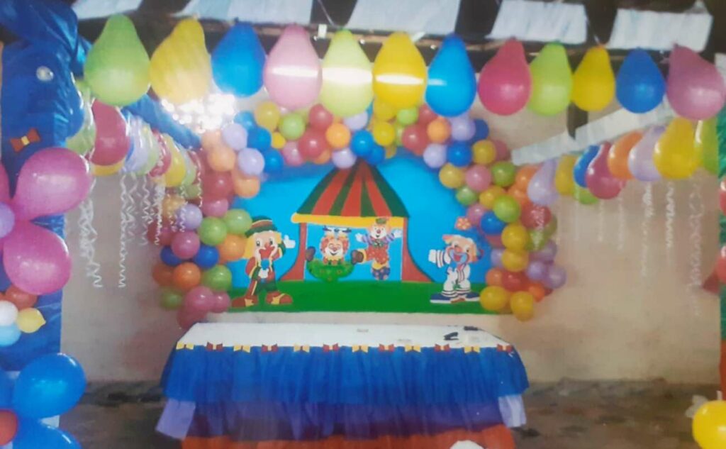 Assim como na quadra, ele montou tudo. Até os ladrilhos das paredes são arte dele. Para as festas foi ampliando e melhorando na decoração e na estrutura para tal.