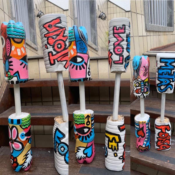 Foi nesse momento que Chris teve a ideia de produzir arte nos pesos, feitos de cimento e material reciclado. “Meu trabalho é voltado para simbologias, com palavras, escritos e símbolos. Os pesos foram pintados à mão com uma arte bem POP, colorida, urbana e com mensagens de grafite. E assim foi o início de uma nova etapa e mais uma descoberta na minha carreira. Dentro dessa situação adversa, tive esse novo momento, um plus na minha vida”.