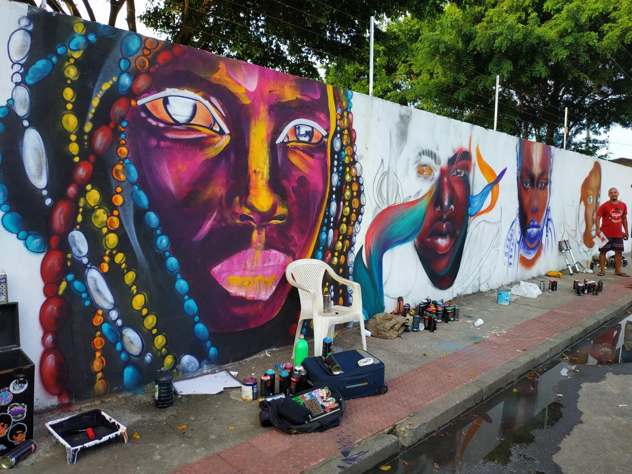 Artistas expõem arte a céu aberto pintando muro de Guarapari