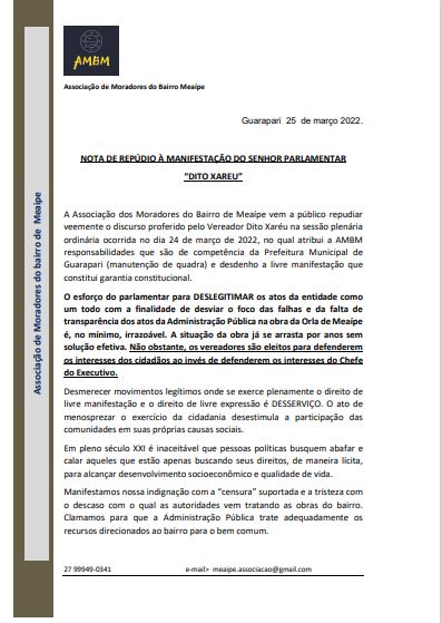A Associação de Moradores do Bairro Meaípe (AMBM) publicou nas redes sociais uma nota em que repudia o discurso do vereador Dito Xaréu (PSDB), em que o parlamentar criticou a manifestação realizada pelos moradores do bairro na terça-feira (22). Na ocasião da manifestação, os moradores cobraram da Prefeitura de Guarapari celeridade nas obras de pavimentação e revitalização do bairro, na qual parte dos recursos podem expirar ainda este ano.