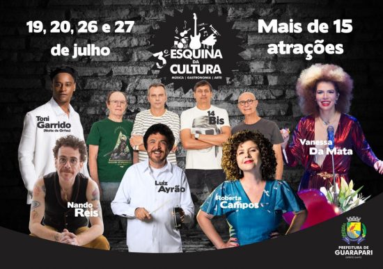 Nos dias 19, 20, 26 e 27 de julho o Centro de Guarapari irá receber mais uma edição da Esquina da Cultura, evento que conta com música, gastronomia e arte. Em sua terceira edição, o Esquina já teve suas atrações principais divulgadas em uma rede social, na última sexta-feira (19). Nomes como Nando Reis, 14 Bis, Vanessa da Matta, Luiz Ayrão, Roberta Campos e Tony Garrido, já estão confirmados para participar do evento.