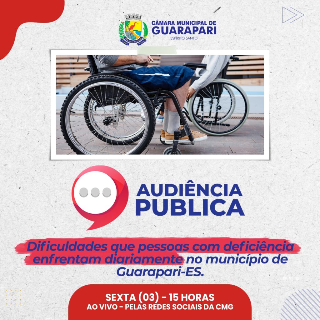 Nessa sexta-feira (03), às 15h, a Câmara Municipal de Guarapari realizará uma Audiência Pública para debater as dificuldades enfrentadas pelas pessoas que possuem algum tipo de deficiência residentes no município.
