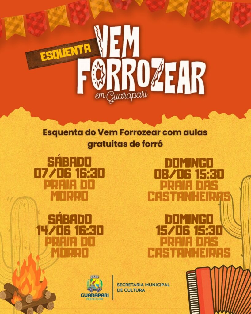 O clima junino vai começar a tomar conta de Guarapari neste sábado (7) com o início do esquenta do “Vem Forrozear”. A proposta é animar moradores e turistas com aulas gratuitas de forró pé de serra em dois dos pontos turísticos mais movimentados da cidade: as praias do Morro e das Castanheiras. A atividade é promovida pela Secretaria Municipal de Cultura como prévia do grande festival junino que acontece entre os dias 19 e 22 de junho.