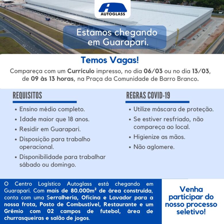 O Centro de Distribuição e Logística da Autoglass, Barro Branco, Guarapari, divulgou oportunidades de trabalho para moradores do município. É necessário ser maior de 18 anos e ter o ensino médio completo.