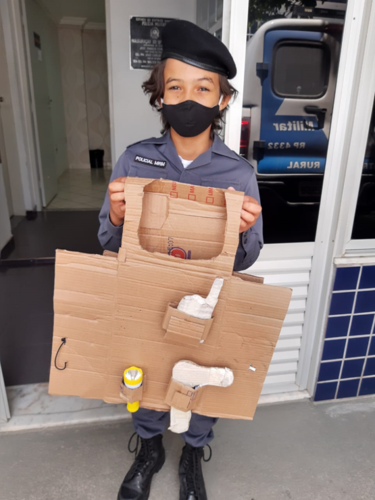 Durante a visita, a mãe de Matheus, Joice, levou um colete feito de papelão feito pelo próprio filho para brincar imaginando ser um policial. “Desde os 4 anos ele quer ser da polícia. Já fez colete, pintou a parede com tema de policiais, e para todos os agentes na rua para conversar” contou a mãe.