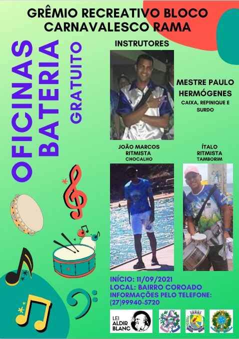 O Grêmio Recreativo e Bloco Carnavalesco Rama (popular Bloco Rama), está promovendo uma oficina gratuita de instrumentos musicais de bateria de escola de samba para iniciantes ou para quem quiser se aperfeiçoar.